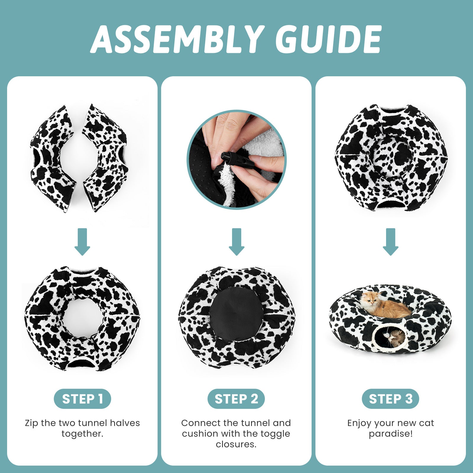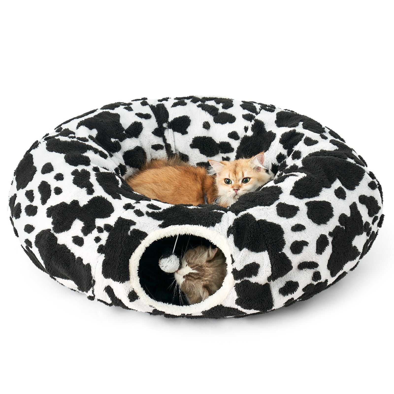 Easily shape into circle, S-shape or semi-circle configurations to match your cat's mood. The hidden play zone converts to a plush bed when playtime is over.