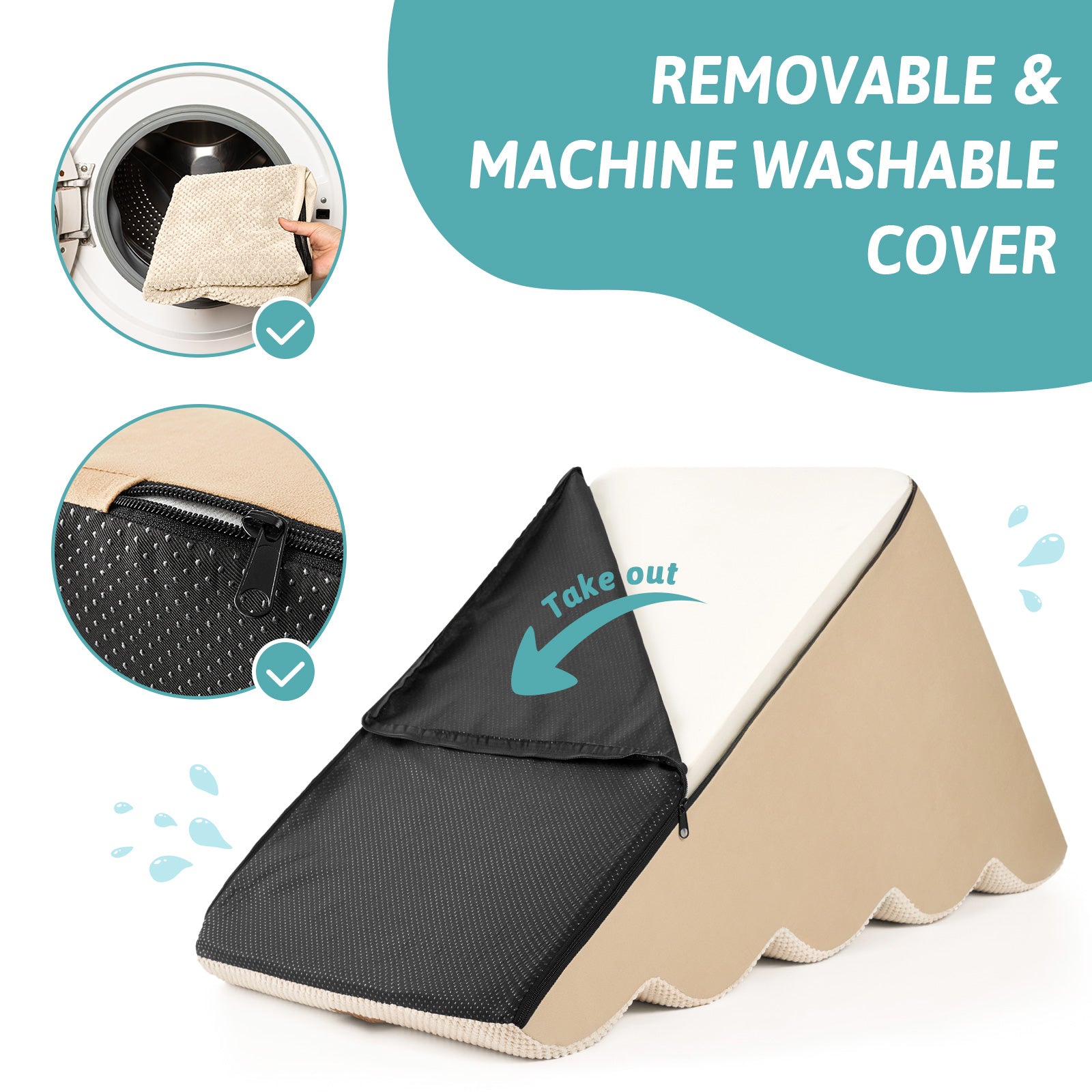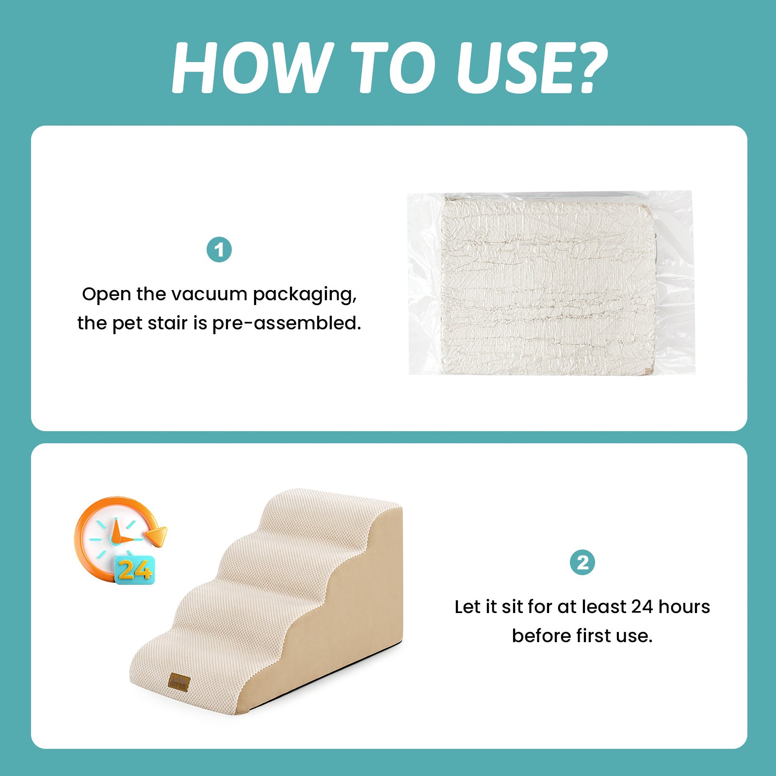 - EASY TO USE & CLEAN: The dog steps for couch are vacuum compressed and packaged. No assembly is required after arrival. Just open the package and wait for 24-48 hours for the sponge to fully expand and fill the cover before use. There is a convenient handle at the back for easy carrying. The outer cover can be removed for cleaning and supports machine washing or hand washing. Note: Do not clean the sponge foam.