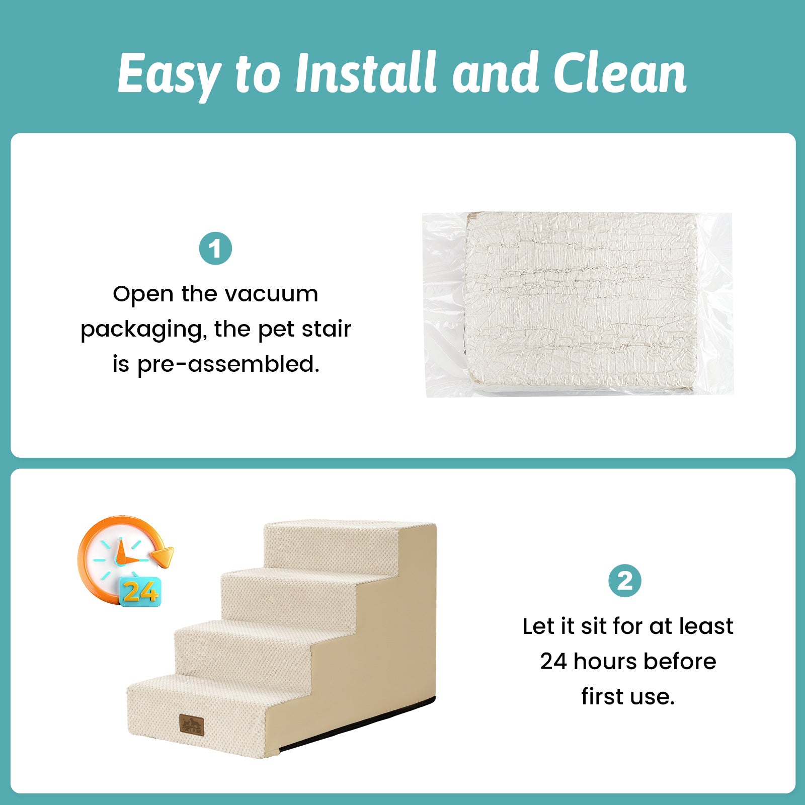 No Assembly Needed: This doggie stairs for sofa couch arrive vacuum-packed for eco-friendly shipping! Simply unbox, unroll, and watch it expand. For the best experience, allow 24-48 hours for the foam to fully fluff up to its final shape. Any initial wrinkles will smooth out naturally. No tools or assembly required, your pet can almost start using it right away!
